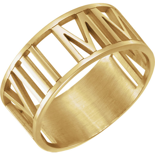 This 14kt yellow gold Roman numeral date ring is a wonderful way to celebrate your anniversary. Please enter the date in MM-DD-YYYY format. Ring width: 7.75mm. Standard fit. Approximate weight: 5.6 grams. Made in the USA.