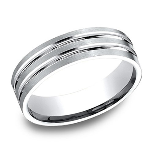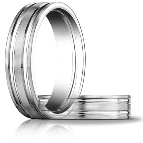 Platinum wedding band has satin finish with two polished round ridges. Die struck and comfort fit. Width: 6mm. Thickness: 1.9mm. Solid platinum 950 [95% Platinum, 5% Ruthenium alloy] Made in USA.