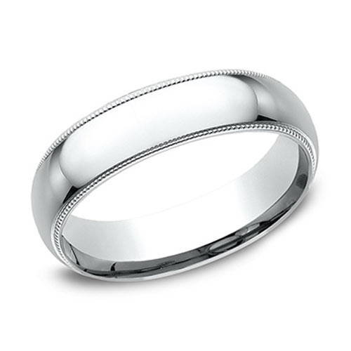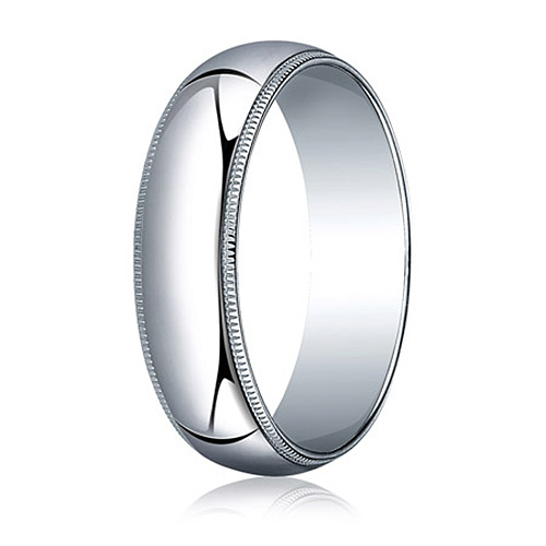 Platinum milgrain wedding band is die struck and standard fit. Oval center, polished finish. Width: 6mm, thickness: 1.3mm. Solid platinum 950 [95% Platinum, 5% Ruthenium alloy] Made in USA. Size 9 ring weighs approximately 9.3 grams.Lifetime GuaranteeIf your ring is ever damaged during normal wear, the manufacturer will repair or replace your wedding ring free of charge. If your finger size ever changes, the manufacturer will resize or replace your ring free of charge. In the case that the manufacturer has to add material to your ring, you will only be charged for the difference in the additional metal or stones needed to restore the piece. Guarantee ParametersThe guarantee does not cover rings that have been ordered in the wrong finger size or finger sizes that may have changed between the time of purchase and the actual physical receipt of the piece. Third party alterations, other than engraving, will void the warranty.The manufacturer reserves the right to deny the Lifetime Guarantee for any ring that shows signs of abuse or tampering.