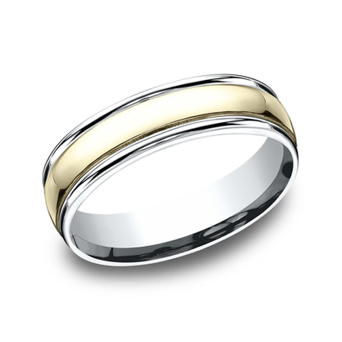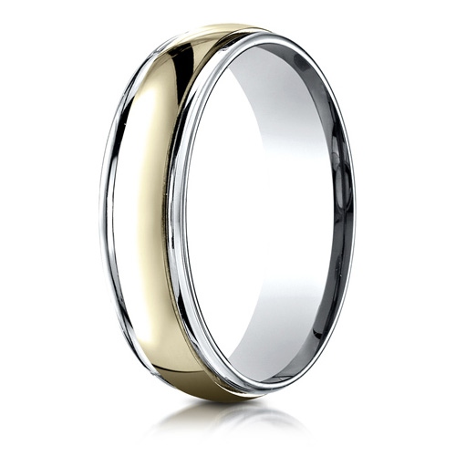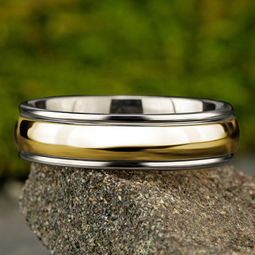 This solid 18k yellow gold and platinum wedding band is comfort fit and die struck. Width: 6mm, thickness: 1.8mm. High polish finish. Solid platinum 950 [95% Platinum, 5% Ruthenium alloy] and 18k yellow gold. Made in USA.
