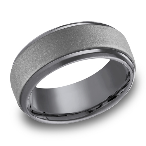 This Benchmark gray tantalum 8mm wedding band has a satin finish and domed center. Polished beveled edges. Comfort-fit. Tantalum is a dark gray metal that is sturdy, hypoallergenic, and scratch resistant. Made in the USA.