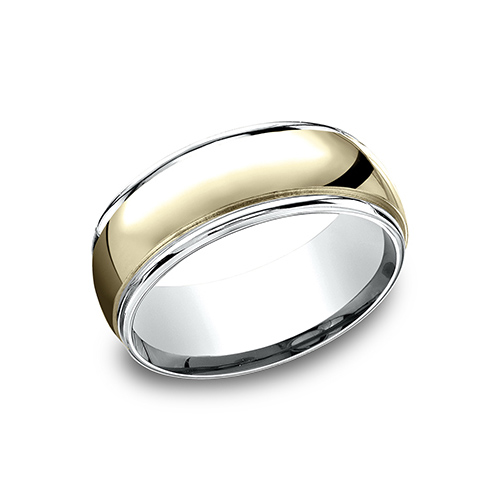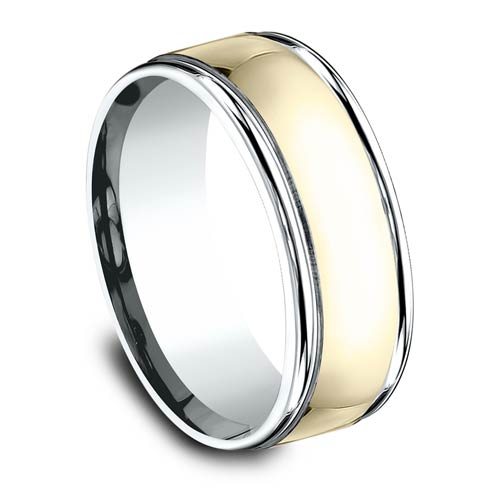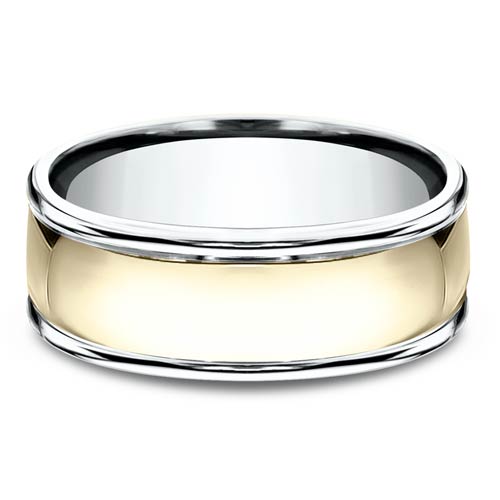 Polished solid 14k yellow and white gold wedding band has ridged edges. Die struck and comfort fit. Ring width: 8mm. Ring thickness: 1.9mm. This ring is made from 100% recycled gold, sourced directly from suppliers with Scientific Certification Services recycled content certification. Made in USA.