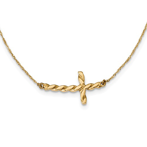 This twisted sideways cross necklace is made of polished solid 14k yellow gold. Pendant size: 1in x 1/2in. Weight: 1.8 grams. 14k yellow gold 17in Singapore rope chain has a spring ring clasp. Chain width: 0.7mm. Made in the USA.