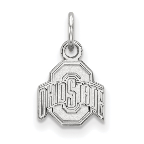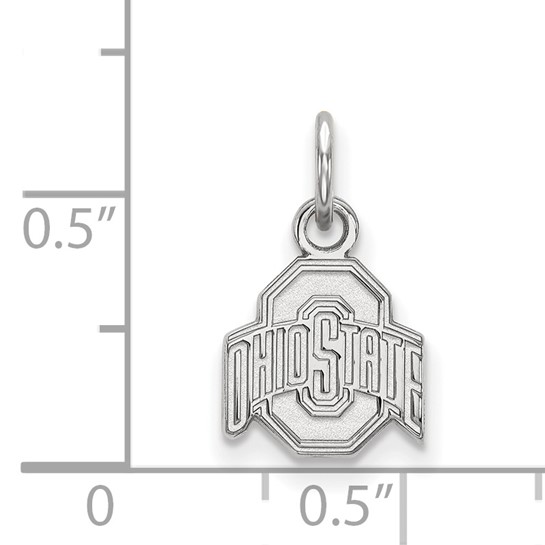This extra small Ohio State University logo pendant is made of polished 10k white gold. Item length: 10mm, width: 9mm. Officially licensed jewelry. Weight: 0.6 grams. Made in the USA. Fits up to a 1mm chain.