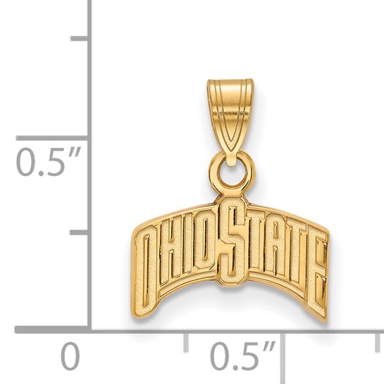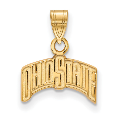 The small Ohio State University arched pendant is made of polished 10k yellow gold. Item length: 10mm, width: 13mm. Officially licensed jewelry. Weight: 0.6 grams. Made in the USA. Fits up to a 3mm chain.
