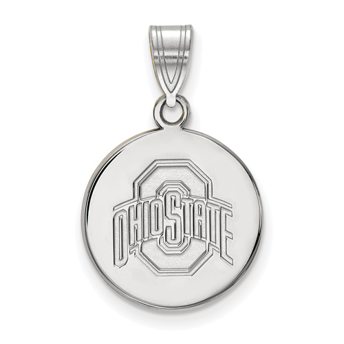Ohio State University logo disc pendant is made of polished 14k white gold. Item length: 16mm, width: 15mm. Officially licensed jewelry. Weight: 2.1 grams. Made in the USA. Fits up to a 4mm chain.