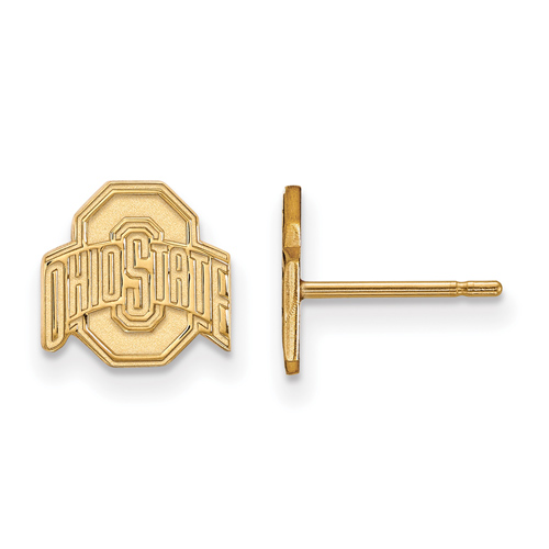 Ohio State University logo post earrings made of polished 14k yellow gold. Item length: 9mm width: 9mm. Officially licensed jewelry. Weight: 1.3 grams. Made in the USA.