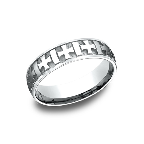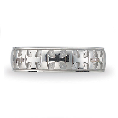Die struck and comfort fit. Repeating iron crosses. Polished finish. Width: 6mm. Solid 14k white gold. This ring is made from 100% recycled gold, sourced directly from suppliers with Scientific Certification Services recycled content certification. Made in USA.