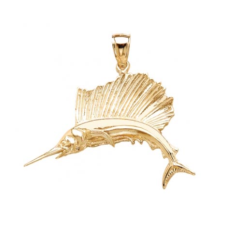 High polished sailfish pendant is made of 14k yellow gold. Dimensions: 1 5/8in x 1in. Open back. Weight: 4.3 grams. Made in Peru.