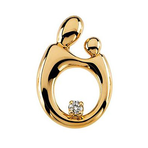 Mother and child diamond pendant is made of 14k yellow gold. One 0.10 CT TW [2.4mm] round diamond, color H-I, clarity SI. Dimensions: 20.25mm long and 14mm wide. Weighs 1.25 DWT (1.94 grams). Please note: weight is approximate, actual weight may vary. Chain not included. Hollow back.