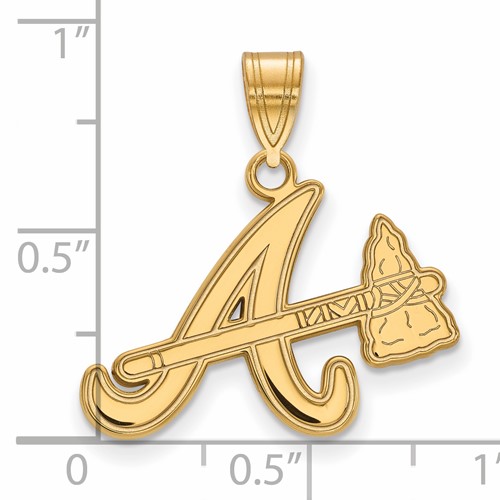 Atlanta Braves tomahawk A pendant is made of polished 10k yellow gold. Item size: 22mm x 15mm. Officially licensed MLB jewelry. Weight: 1.4 grams. Made in the USA. Fits up to a 4mm chain.
