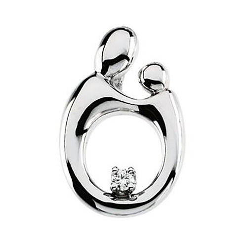 This mother and child diamond pendant is made of polished 14kt white gold. One 0.20 CT TW [3.0mm] round diamond, color H-I, clarity SI. Dimensions: 20.75mm long and 13.75mm wide. Weighs 1.80 DWT (2.80 grams). Please note: weight is approximate, actual weight may vary. Chain not included. Solid back.