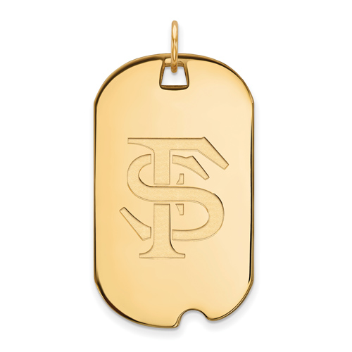 Florida State University large dog tag is made of polished 14k yellow gold. Item length: 40mm, width: 24mm. Officially licensed jewelry. Weight: 9.1 grams. Made in the USA. Fits up to a 4mm chain.