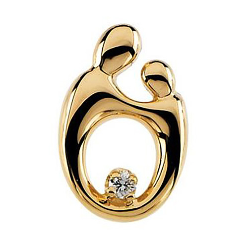 Mother and child diamond pendant is made of polished solid 14k yellow gold. One 0.20 CT TW [3.0mm] round diamond, color H-I, clarity SI. Solid back. Dimensions: 14.75mm x 10mm. Weighs 1.40 grams. Please note: weight is approximate, actual weight may vary. Chain not included.