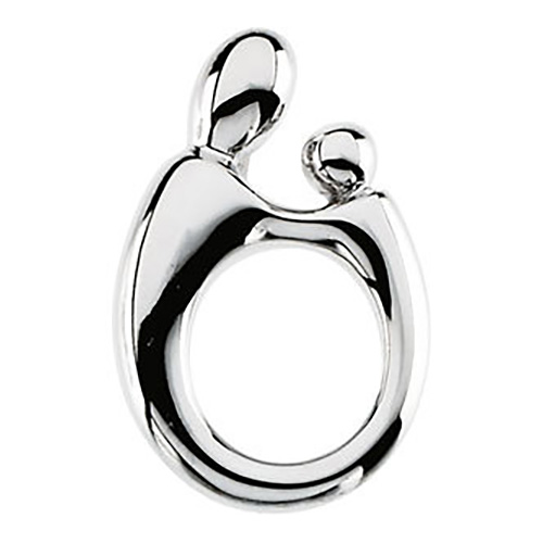 Mother and child pendant has a hollow back and is made of polished 14k white gold. Dimensions: 20.5mm x 13.5mm. Rhodium-plated. Fits up to a 3mm wide chain. Approximate weight: 1.9 grams.
