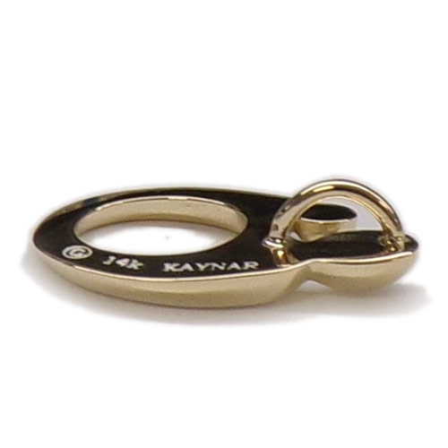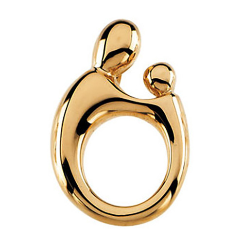 This solid 14k yellow gold mother and child pendant is designed by Janel Russell. Dimensions: 20.5mm long and 13.5mm wide. This item is slightly larger than a penny. Fits up to a 2mm wide chain. There is a hidden bail on the back where the chain fits. Approximate weight: 2.80 grams. Flat back.