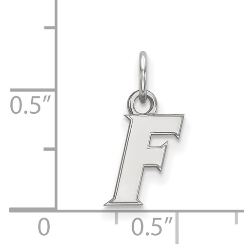 This very small University of Florida F pendant is made of polished 10k white gold. Item height: 3/8in, width: 5/16in. Officially licensed jewelry. Weight: 0.35 grams. Made in the USA. Fits up to a 3mm chain.