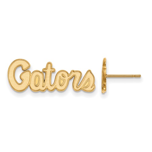 These extra small University of Florida Gators script post earrings are made of polished 10k yellow gold. Item length: 3/8in, width: 7/8in. Officially licensed jewelry. Weight: 1.9 grams. Made in the USA.
