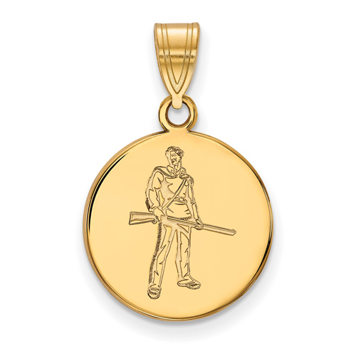 West Virginia University mountaineer disc pendant is made of polished 14k yellow gold. Item length: 16mm, width: 15mm. Officially licensed jewelry. Weight: 2.1 grams. Made in the USA. Fits up to a 4mm chain.