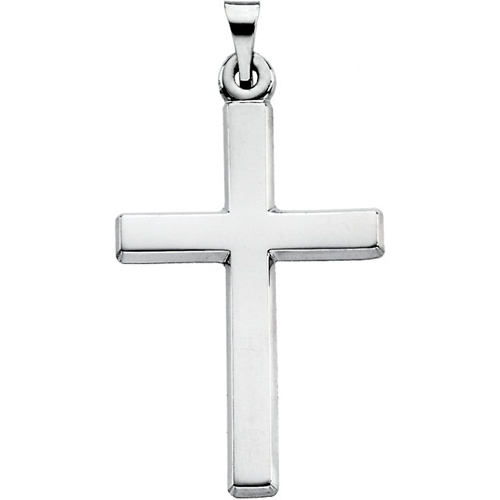 This classic smooth flat Latin cross pendant is made of solid 14k white gold. Dimensions: 24.5mm x 16.5mm. This cross is the size of a quarter. Fits up to a 2.5mm wide chain. Polished finish. Flat back. Weight: 1.63 grams. Please note: weight is approximate, actual weight may vary.