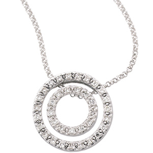 Pendant is 3/4in in diameter, the size of a penny. This necklace dazzles with 36 .007 CT round diamonds. Two concentric circles symbolize the eternal bonds of love. Diamond color H-I, clarity I1. Polished 14kt white gold. Chain sold separately.