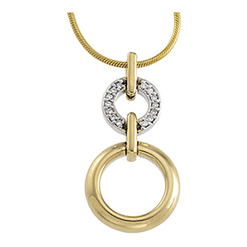 Two 14kt white and yellow gold circles of love pendant has genuine diamond accents. 0.07 CT TW of 14 round full cut diamonds, diamond color H-I, clarity I1. Weighs approximately 1.95 DWT [3.03 grams]