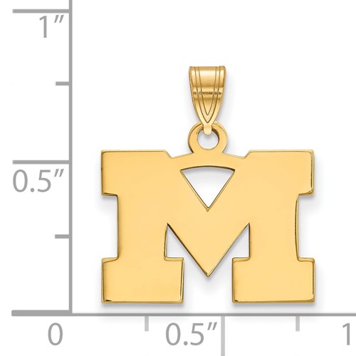 This University of Michigan M pendant is made of polished 14k yellow gold. Item height: 1/2in, width: 5/8in. Officially licensed jewelry. Weight: 2.5 grams. Made in the USA. Fits up to a 3mm chain.