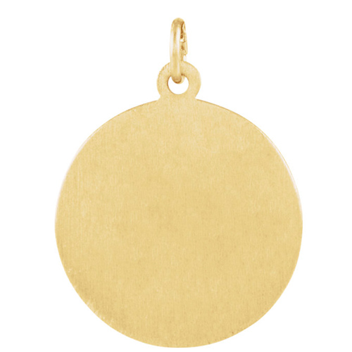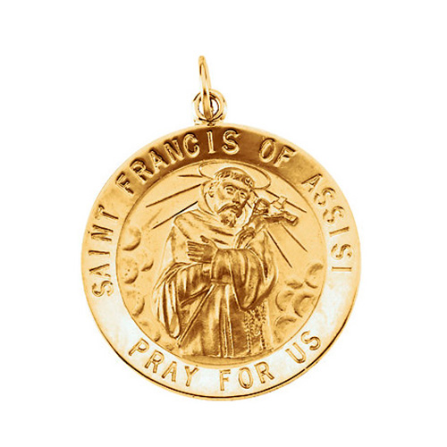 Round St. Francis medal is made of polished 14k yellow gold. This medal depicts St. Francis embracing the cross of Jesus. Dimensions: 22mm diameter. This item is the size of a nickel. Weight: 3.92 grams. Please note: weight is approximate, actual weight may vary. Chain not included.