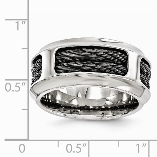 This polished Edward Mirell gray titanium ring features two inset memory cables. Ring width: 10.75mm. Made in the USA. Weight: 9.6 grams.BLACK MEMORY CABLE - Spectore's black cable is crafted with 12 very fine strands of memory metal used extensively throughout the medical industry due to its perfect bio-compatibility. In addition to its rich stylish look, this material provides extreme durability and a remarkable ability to retain its intended profile.