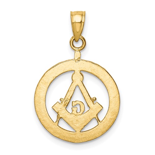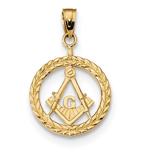The masonic wreath pendant is made of 14kt yellow gold. Item size: 5/8in without bail. Flat back. Weight: 1.2 gram. Fits up to a 3mm wide chain. Made in USA.