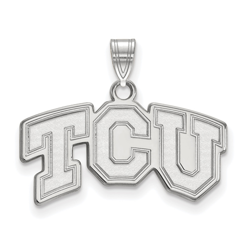 Texas Christian University TCU arched pendant is made of polished 14k white gold. Item length: 13mm, width: 24mm. Officially licensed jewelry. Weight: 2.0 grams. Made in the USA. Fits up to a 3mm chain.