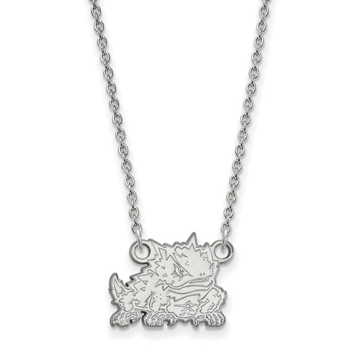This small Texas Christian University horned frog pendant with chain is made of polished 14k white gold. Pendant length: 12mm, width: 14mm. Chain length: 18in. Officially licensed jewelry. Weight: 1.5 grams. Made in the USA.