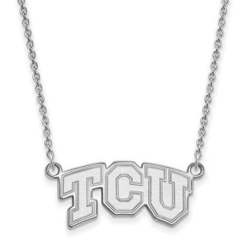 This small Texas Christian University pendant with chain is made of polished 10k white gold. Pendant height: 12mm, width: 25mm. Chain length: 18in. Officially licensed jewelry. Weight: 2.0 grams. Made in the USA.