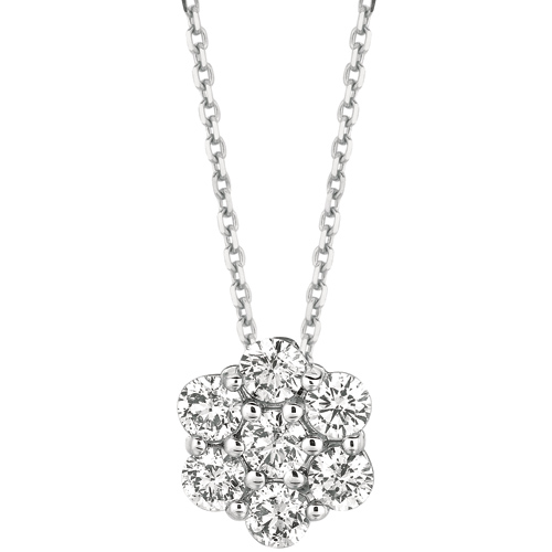 This 14kt white gold 1/2 ct tw diamond cluster necklace features seven round diamonds. Diamond details: 7 x .07 ct round full cut diamonds, SI1-SI2 clarity, G-H color. Chain has a lobster clasp. Necklace length: 18in. Made in USA.