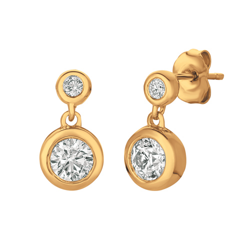 1/2 ct tw two-stone diamond bezel dangle earrings are made of 14k yellow gold. Friction backs. Diamond details: round full cut diamonds, SI1-SI2 clarity, G-H color. Made in USA.