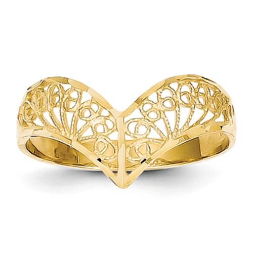 Polished 14k yellow gold filigree ring is V-shaped. Diamond-cut. Ring top width: 10mm. Weight: 1.1 gram. Made in USA.
