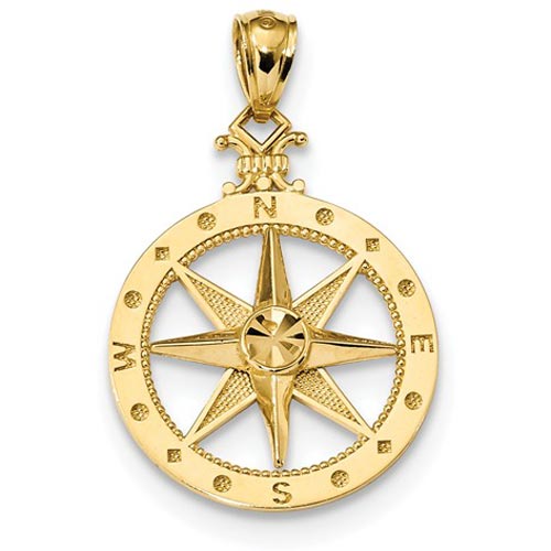 This diamond-cut round compass pendant is made of 14kt yellow gold. Item size: 3/4in x 3/4in. Polished and satin finish. Fits up to a 3.5mm wide chain. Textured back. Weight: 1.7 grams. Made in the USA.