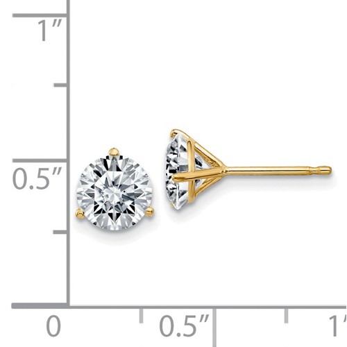 This dazzling pair of moisssanite martini stud earrings is crafted in 14k yellow gold. 6.5mm round brilliant cut moissanite is set in each ear. 2.0 carat total diamond equivalent weight. Near colorless gem. Color G-H. Clarity: VS1-VS2. 4H silicon carbide. Three-prong earrings have friction backs. Item weight: 0.3 grams. Made in the USA.