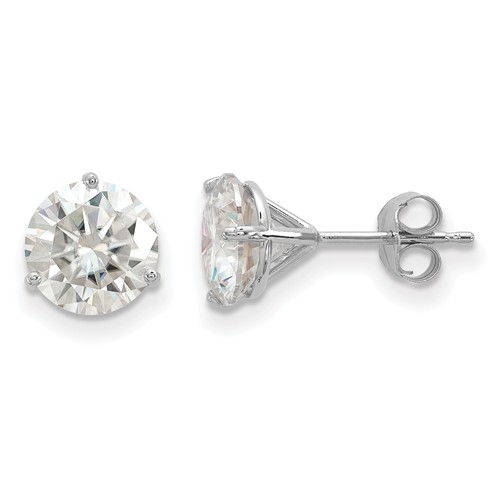 This gorgeous pair of moisssanite martini stud earrings is crafted in 14k white gold. 7.5mm round brilliant cut moissanite is set in each ear. 3.0 carat total diamond equivalent weight. Near colorless gem. Color G-H. Clarity: VS1-VS2. 4H silicon carbide. Three-prong earrings have friction backs. Item weight: 0.34 grams. Made in the USA.
