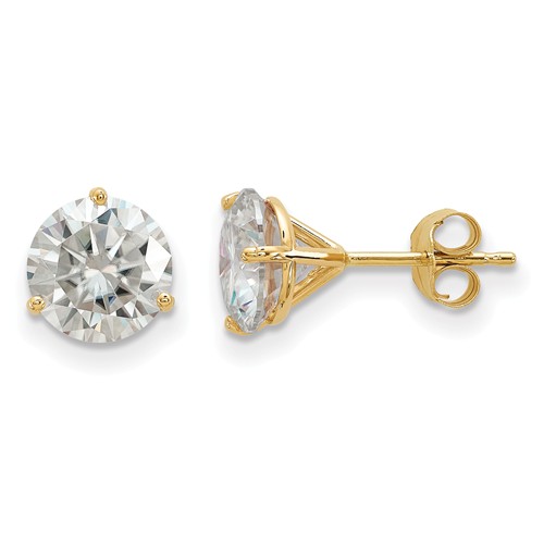 This gorgeous pair of moisssanite martini stud earrings is crafted in 14k yellow gold. 7.5mm round brilliant cut moissanite is set in each ear. 3.0 carat total diamond equivalent weight. Near colorless gem. Color G-H. Clarity: VS1-VS2. 4H silicon carbide. Three-prong earrings have friction backs. Item weight: 0.34 grams. Made in the USA.