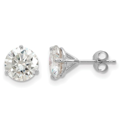 This pair of large moisssanite martini stud earrings is crafted in 14k white gold. 8mm round brilliant cut moissanite is set in each ear. 4.0 carat total diamond equivalent weight. Near colorless gem. Color G-H. Clarity: VS1-VS2. 4H silicon carbide. Three-prong earrings have friction backs. Item weight: 0.34 grams. Made in the USA.