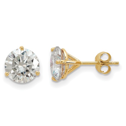 This pair of large moisssanite martini stud earrings is crafted in 14k yellow gold. 8.0mm round brilliant cut moissanite is set in each ear. 4.0 carat total diamond equivalent weight. Near colorless gem. Color G-H. Clarity: VS1-VS2. 4H silicon carbide. Three-prong earrings have friction backs. Item weight: 0.34 grams. Made in the USA.