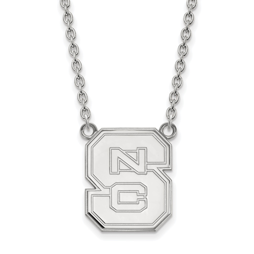 North Carolina State University block S pendant is made of polished 14k white gold. Item length: 3/4in, width: 5/8in. Officially licensed jewelry. Weight: 2.9 grams. Made in the USA. Fits up to a 4mm chain.