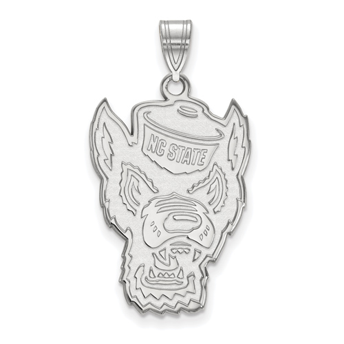 This large North Carolina State University Mr. Wuf pendant is made of polished 14k white gold. Item length: 1in, width: 11/16in. Officially licensed jewelry. Fits up to a 4mm wide chain. Weight: 3.0 grams. Made in the USA.