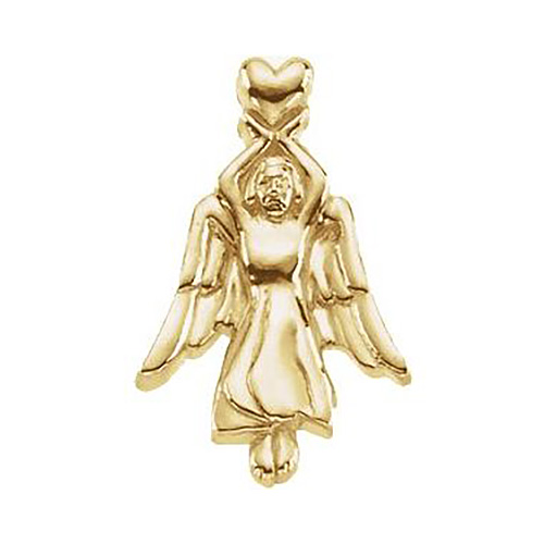 Angel with heart lapel pin is made of 14k yellow gold. Dimensions: 22mm x 14.5mm. Weighs 3.22 grams. Please note: weight is approximate, actual weight may vary.