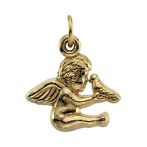 This very small angel holding a dove pendant is made of solid 14k yellow gold. Dimensions: 12mm x 12mm. Weighs 0.60 grams. Please note: weight is approximate, actual weight may vary. Chain not included.