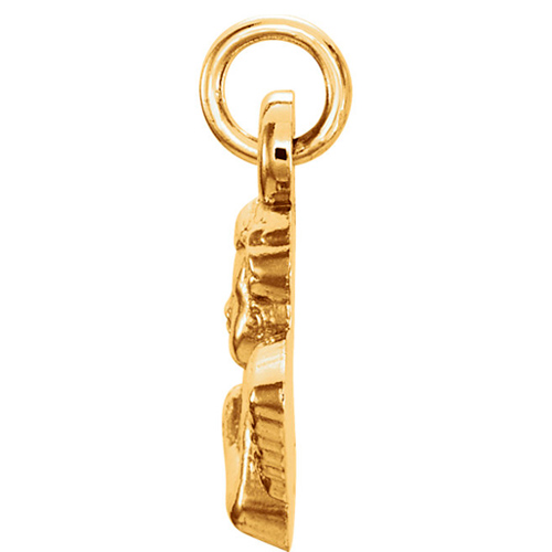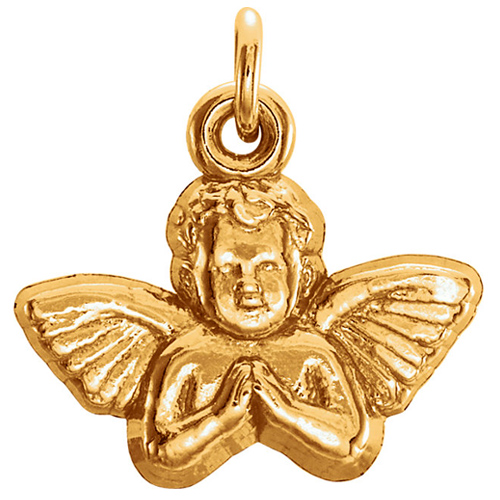 This very small solid 14k yellow gold baby angel pendant has a polished finish. Item size: 1/2in x 3/8in. Fits up to a 2mm wide chain. Approximate weight: 0.85 grams. Made in USA.