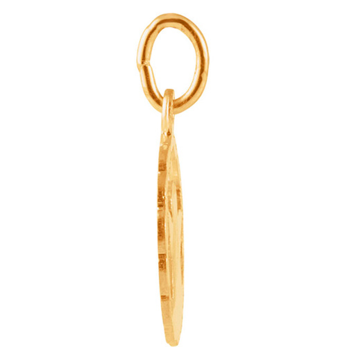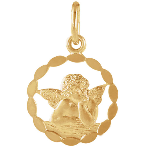 Cut-out round Raphael angel pendant is made of polished 14kt yellow gold. Wavy borders. Dimensions: 12mm x 12mm. Weight: 0.59 grams. Please note: weight is approximate, actual weight may vary. Chain not included.