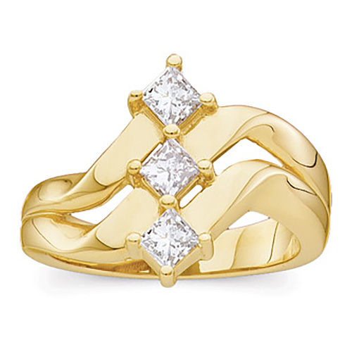 This gorgeous contemporary 14kt yellow gold right hand diamond ring features 5/8 CT total weight of diamonds. 3 Princess cut diamonds in a polished yellow gold setting weighs 3.92 DWT (6.09 grams). Diamond details: 3 x 3.25mm princess cut diamonds, I1 clarity, G-H color. Available while supplies last.