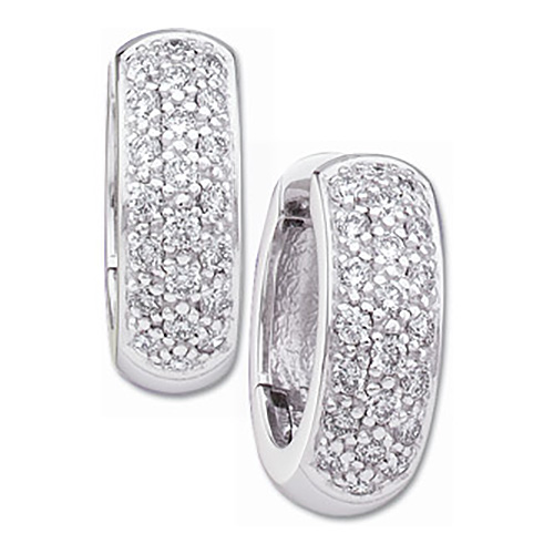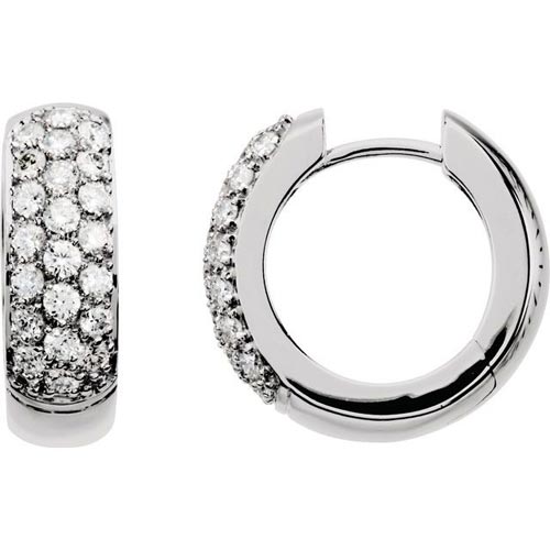 This pair of gorgeous 14k white gold diamond pave hoop earrings are 16.50mm. Each earring is slightly smaller than a dime. 44 round natural diamonds, 7/8 carat total weight, SI1 clarity, G-H color. Hinged. Approximate weight: and weigh 5.15 grams.